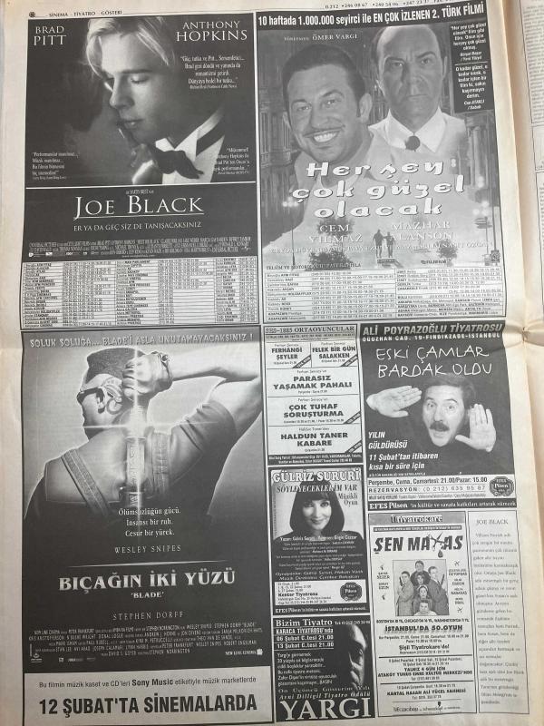 MİLLİYET GAZETESİ DOĞUM GÜNÜ HEDİYESİ - 6 ŞUBAT 1999 -TAM TAKIM 34 SAYFADIR -Tunca Bengin-Orhan Falelioğlu-Barış Manço-Vahap Yazaroglu-Metin Tokher-Sami Kohen-Hasan Cemal-Güneri Cıvaoğlu-Hüseyin Kıvrıkoğlu-Zekeriya Temizel-Selahattin Özmen-Turgay Bayazıt-Erdoğan Şenay-Feyyaz Uçar-Togay Bayatlı-Kartal Yiğit-Gürcan Bilgiç-Vedat Vatansever-Vedat Saygı-Vedat Caglar-Fevzi Aksoy-Mustafa Denizli-Selim Mümtaz-Atilla Tüfek-Tuncay Örnek-Ali Sirmen-Ahmet Çakar-Rahim Zafer-Feyyaz Uçar-Köksal Özbek-Sergen Yalçın-Özgün Özgürgün-Mike Tyson-Cem Yılmaz-Mazhar Alanson-Brad Pitt-Anthony Hopkins-Wesley Snipes-Stephen Dorff-Ömer Vargı-Melike Demirağ-Müjdat Gezen-Haluk Bilginer-Gülriz Sururi-Müzeyyen Senar-Nükhet Duru-Tarkan Tevetoglu-Benim Adım Joe-Robbie Williams-Bülent Ortaçgil-Cem Karaca-Barış Manço anısına-Krallar da ölür-Kartal söktü aldı-Krize Hataylı formülü-G.Saray Dünya 23’sü-Avrupa Şampiyonası garanti-Her şey çok güzel olacak-Bıçağın iki yüzü-Joe Black-Hayat Güzeldir-İlk görüşte aşk-Aşk Mektubu, Ali Naci Karacan tarafından kaleme alınmıştır. MİLLİYET GAZETESİ DOĞUM GÜNÜ HEDİYESİ - 6 ŞUBAT 1999 -TAM TAKIM 34 SAYFADIR -Tunca Bengin-Orhan Falelioğlu-Barış Manço-Vahap Yazaroglu-Metin Tokher-Sami Kohen-Hasan Cemal-Güneri Cıvaoğlu-Hüseyin Kıvrıkoğlu-Zekeriya Temizel-Selahattin Özmen-Turgay Bayazıt-Erdoğan Şenay-Feyyaz Uçar-Togay Bayatlı-Kartal Yiğit-Gürcan Bilgiç-Vedat Vatansever-Vedat Saygı-Vedat Caglar-Fevzi Aksoy-Mustafa Denizli-Selim Mümtaz-Atilla Tüfek-Tuncay Örnek-Ali Sirmen-Ahmet Çakar-Rahim Zafer-Feyyaz Uçar-Köksal Özbek-Sergen Yalçın-Özgün Özgürgün-Mike Tyson-Cem Yılmaz-Mazhar Alanson-Brad Pitt-Anthony Hopkins-Wesley Snipes-Stephen Dorff-Ömer Vargı-Melike Demirağ-Müjdat Gezen-Haluk Bilginer-Gülriz Sururi-Müzeyyen Senar-Nükhet Duru-Tarkan Tevetoglu-Benim Adım Joe-Robbie Williams-Bülent Ortaçgil-Cem Karaca-Barış Manço anısına-Krallar da ölür-Kartal söktü aldı-Krize Hataylı formülü-G.Saray Dünya 23’sü-Avrupa Şampiyonası garanti-Her şey çok güzel olacak-Bıçağın iki yüzü-Joe Black-Hayat Güzeldir-İlk görüşte aşk-Aşk Mektubu adlı eser Türkçe dilindedir.