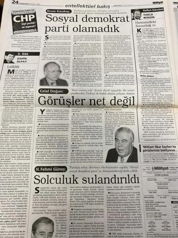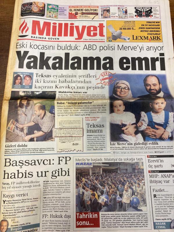 MİLLİYET GAZETESİ DOĞUM GÜNÜ HEDİYESİ - 8 MAYIS 1999 - TAM TAKIM 38 SAYFADIR -Yasemin Congar-Mehmet Çınar-Vural Savaş-Fikret Bila-Taha Akyol-Hakan Şükür-Vedat Danacı-Cengiz Malgir-Yalçın Doğan-Ercan Karakaş-Celal Doğan-H. Fehmi Güneş-Şahin Alpay-Tunca Bengin-Umur Talu-Ara Güler-Aydın Doğan-Doğan Hızlan-Birgit Yakalama emri-Analar ağlamasın-Feldkamp ders verdi-Sosyal demokrat parti olamadık-Görüşler net değil-Solculuk sulandırıldı-Objektifin gururu Eski kocasını bulduk ABD polisi Merve’yi arıyor-Teksas şerifleri Kavakçı’nın peşinde-Mahkeme kararı var-Baba: Ailece yalancılar-Teksas imamı-Merve’nin gizlediği evlilik-Başsavcı FP habis ur gibi-Meclis’te başladı Malatya’da sokağa taştı-Tahrikin sonu-Hakan Şükür Anneler Günü’nü kutladı-Babalar Günü ne zaman-Feldkamp ders verdi-Yıldıray alınsın-Şaşırtan iddia-Divan toplanıyor-Sosyal demokrasinin sorunları üzerine Ercan Karakaş Celal Doğan ve H. Fehmi Güneş değerlendirmelerde bulundu-Laiklik ve solculuk tartışıldı-Aydın Doğan Vakfı Görsel San, Ali Naci Karacan tarafından kaleme alınmıştır. MİLLİYET GAZETESİ DOĞUM GÜNÜ HEDİYESİ - 8 MAYIS 1999 - TAM TAKIM 38 SAYFADIR -Yasemin Congar-Mehmet Çınar-Vural Savaş-Fikret Bila-Taha Akyol-Hakan Şükür-Vedat Danacı-Cengiz Malgir-Yalçın Doğan-Ercan Karakaş-Celal Doğan-H. Fehmi Güneş-Şahin Alpay-Tunca Bengin-Umur Talu-Ara Güler-Aydın Doğan-Doğan Hızlan-Birgit Yakalama emri-Analar ağlamasın-Feldkamp ders verdi-Sosyal demokrat parti olamadık-Görüşler net değil-Solculuk sulandırıldı-Objektifin gururu Eski kocasını bulduk ABD polisi Merve’yi arıyor-Teksas şerifleri Kavakçı’nın peşinde-Mahkeme kararı var-Baba: Ailece yalancılar-Teksas imamı-Merve’nin gizlediği evlilik-Başsavcı FP habis ur gibi-Meclis’te başladı Malatya’da sokağa taştı-Tahrikin sonu-Hakan Şükür Anneler Günü’nü kutladı-Babalar Günü ne zaman-Feldkamp ders verdi-Yıldıray alınsın-Şaşırtan iddia-Divan toplanıyor-Sosyal demokrasinin sorunları üzerine Ercan Karakaş Celal Doğan ve H. Fehmi Güneş değerlendirmelerde bulundu-Laiklik ve solculuk tartışıldı-Aydın Doğan Vakfı Görsel San adlı eser Türkçe dilindedir.
