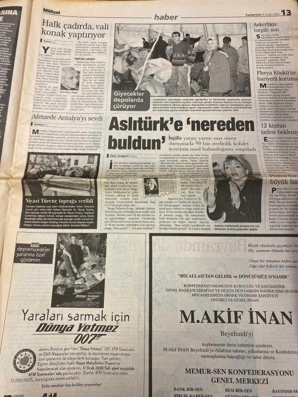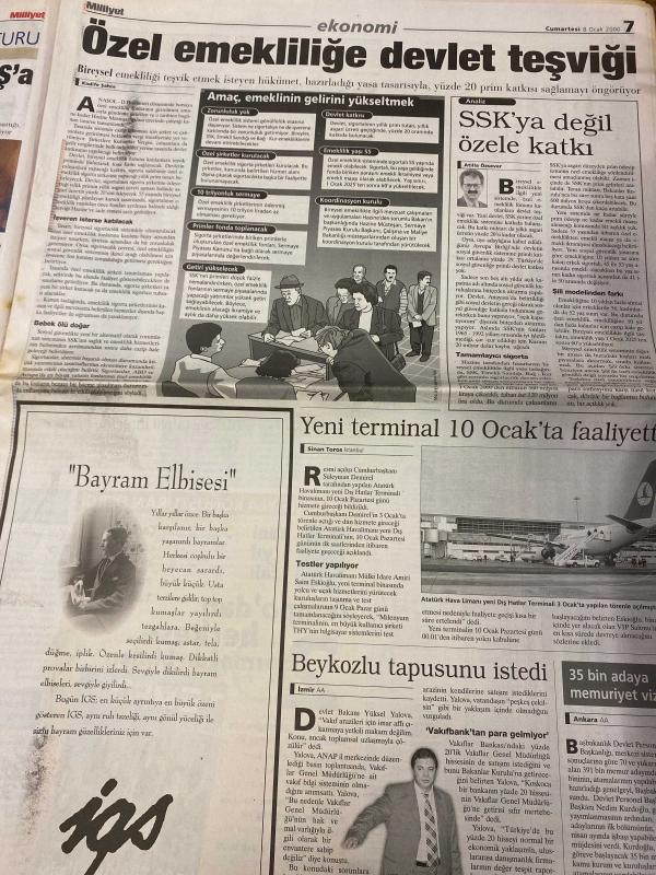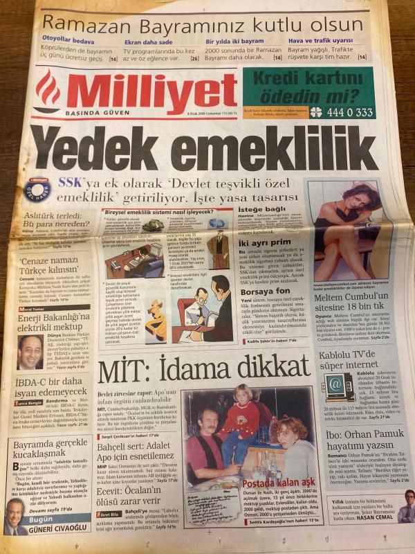 MİLLİYET GAZETESİ DOĞUM GÜNÜ HEDİYESİ - 8 OCAK 2000 - TAM TAKIM 32 SAYFADIR -Gülay Altay-Meral Tamer-Fikret Bila-Tunca Bengin-Hasan Cemal-Güngör Cıvaoğlu-Kadife Şahin-Senura Kardeşoğlu-Bilal Meşe-Atilla Gökçe-Ömer Üründül-Ahmet Çakar-Turay Ürme-Neslihan Cuyar-Turay İpek-Ufuk Türkoğlu-Ali Ayhaber-Sina Koloğlu-Tansel Semer-Meral Tamer Yedek emeklilik-MİT: İdama dikkat-Postada kalan aşk-Yeni yılda eski Kartal-Taraftarımızla barıştık-Bayram şekerleri-Kahraman anneye öpücük-Kuduz’a bir can daha-Nükleersiz bayramlar-Dünya Bankası’ndan TEAŞ’a zehir zemberek mektup-TEAŞ neden zorda SSK’ya ek olarak devlet teşvikli özel emeklilik getiriliyor-Bireysel emeklilik sistemi nasıl işleyecek-MİT’ten Apo’nun infazı hakkında dikkatli olunması yönünde rapor-Ecevit ve Bahçeli’den açıklamalar-Bir gencin posta kutusunda kalan aşk hikayesi-Tayfur’un golüyle Beşiktaş Göztepe’yi 2-1 yendi-Ertuğrul’dan tepki geldi-Bayram ekranlarında şovlar ve programlar yer aldı-Halil Kıvanç ve Bayram konukları ekranda yer al, Ali Naci Karacan tarafından kaleme alınmıştır. MİLLİYET GAZETESİ DOĞUM GÜNÜ HEDİYESİ - 8 OCAK 2000 - TAM TAKIM 32 SAYFADIR -Gülay Altay-Meral Tamer-Fikret Bila-Tunca Bengin-Hasan Cemal-Güngör Cıvaoğlu-Kadife Şahin-Senura Kardeşoğlu-Bilal Meşe-Atilla Gökçe-Ömer Üründül-Ahmet Çakar-Turay Ürme-Neslihan Cuyar-Turay İpek-Ufuk Türkoğlu-Ali Ayhaber-Sina Koloğlu-Tansel Semer-Meral Tamer Yedek emeklilik-MİT: İdama dikkat-Postada kalan aşk-Yeni yılda eski Kartal-Taraftarımızla barıştık-Bayram şekerleri-Kahraman anneye öpücük-Kuduz’a bir can daha-Nükleersiz bayramlar-Dünya Bankası’ndan TEAŞ’a zehir zemberek mektup-TEAŞ neden zorda SSK’ya ek olarak devlet teşvikli özel emeklilik getiriliyor-Bireysel emeklilik sistemi nasıl işleyecek-MİT’ten Apo’nun infazı hakkında dikkatli olunması yönünde rapor-Ecevit ve Bahçeli’den açıklamalar-Bir gencin posta kutusunda kalan aşk hikayesi-Tayfur’un golüyle Beşiktaş Göztepe’yi 2-1 yendi-Ertuğrul’dan tepki geldi-Bayram ekranlarında şovlar ve programlar yer aldı-Halil Kıvanç ve Bayram konukları ekranda yer al adlı eser Türkçe dilindedir.