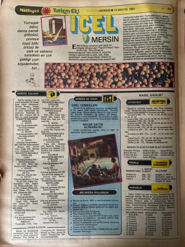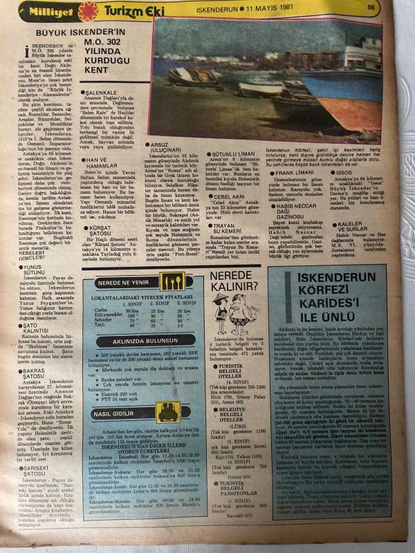 MİLLİYET GAZETESİ TURİZM EKİ (TURKISH NEWSPAPER) - 11 MAYIS 1981 -Büyük İskender-Habib Neccar-Antakya-Antioch-Adana-Tarihte Adana-Ülkemizin Sanayi Merkezlerinden Biri Aynı Zamanda Pamuk Ambarı Adana-Nerelere Gidilir-Kozan Kalesi-Mağarsos-Karatepe-Misis-Yılan Kale-Akçamescit-Ulu Cami-Yağ Camii-Hasan Ağa Camii-Anavarza-Adını Yörenin En Önemli Gölüne Veren İlçe Eğirdir-Nasıl Gidilir-Nerede Kalınır-Nerede Ne Yenir-Aklınızda Bulunsun-Neler Satın Alınabilir-İskenderun-Büyük İskender’in M.Ö. 302 Yılında Kurduğu Kent-Salankale-Han ve Hamamlar-Köprü Satıosu-Kaletini-Bakras Satıosu-Sariseki Satıosu-Arsuz-Uluçınar-Sotunlu Liman-Cebeli Akra-Trayun Su Kemeri-Nerede Ne Yenir-Nasıl Gidilir-Nerede Kalınır-İskenderun Körfezi Karidesi ile Ünlü-İçel-Mersin-Eski Kilikya-Yumuşak İklimi Daire Berrak Gökyüzü ile Yerli ve Yabancı Turistlerin En Çok Geldiği Yurt Köşelerinden Biri-Nerede Kalınır-Nerede Ne Yenir-Özel Yemekleri-Neler Satın Alınabilir-Aklınızda Bulunsun-Nasıl Gidilir-Silifke-Kız Kulesi-Narlıkuyu M adlı eser Türkçe dilindedir.