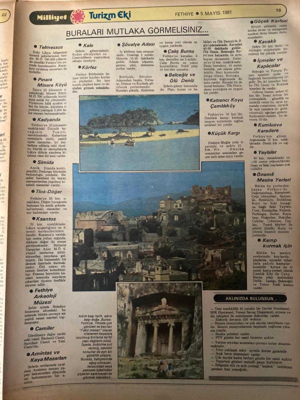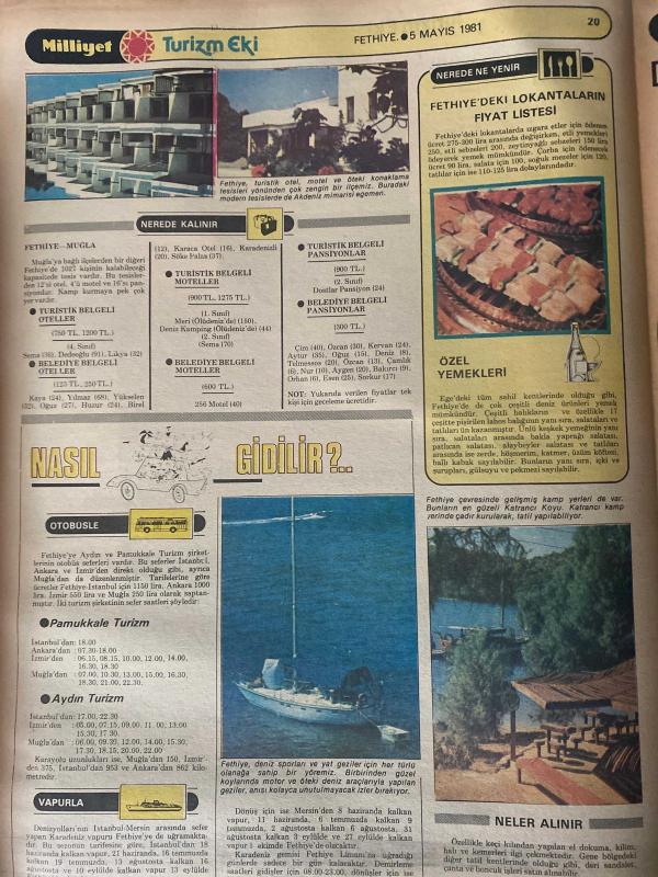 MİLLİYET GAZETESİ TURİZM EKİ (TURKISH NEWSPAPER) - 5 MAYIS 1981 -Fethiye-Köyceğiz-Burdur-Deniz Kum Balık Tarih ve Doğa Zenginliği Deyince Aklınıza Gelen İlk Belde-Fethiye-Deniz Göl Dağ ve Orman İç İçe-Köyceğiz-Nerede Ne Yenir-Fethiye’deki Lokantaların Fiyat Listesi-Özel Yemekleri-Nasıl Gidilir-Neler Alınır-Nerede Kalınır-Nerede Ne Görülür-Susamlık Tepe-Sultanpınar-Insyu-Erenardıç-Hacılar-Kocapınar-Ağlasun-Keşfelli-Gölhisar-Çendik Plajı-Aziziye Köyü ve Ormanları-Fethiye’nin Tarihi Zenginlikleri Saymakla Bitmez-Hatıra Eşya-Şifalı Sular-Festival-Avcılık-Burdur’da Küçüklü Büyüklü 14 Göl Var-Nasıl Gidilir-Burdur’daki Lokantaların Fiyat Listesi-Özel Günler-Nerede Kalınır-Nerede Ne Yenir-Neler Alınır-Şifalı Sular-Tatil Sorununuzu Bize Bırakın-Kıbrıs’a Bizimle Gelin-En Ucuza Gezin Görün-Gemi ile Akdeniz-Yurt İçi Gezileri-Lider Turizm-Sunar adlı eser Türkçe dilindedir.