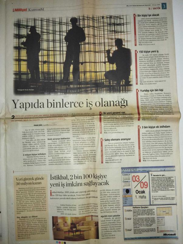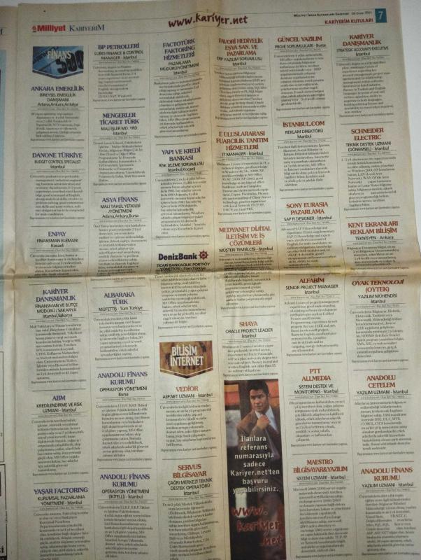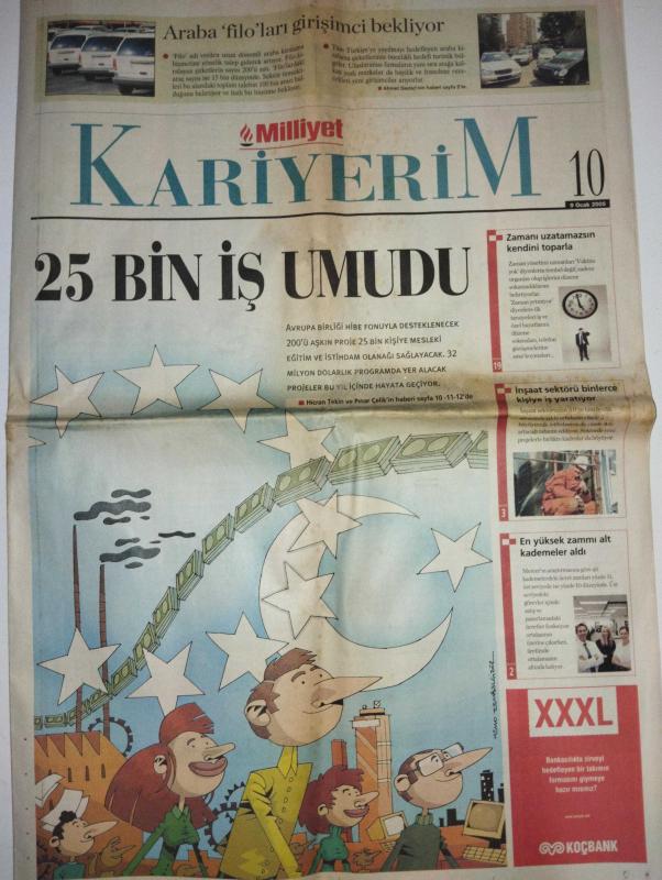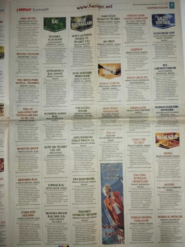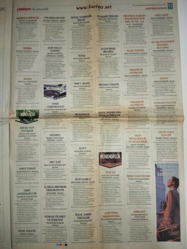 MİLLİYET KARİYERİM GAZETESİ DOĞUM GÜNÜ GAZETESI -9 Ocak 2005-Haluk Karaosman - Onur Sözal - Murat Öğütveren - Yalçın Özen - Burak Akgüç - Sümer Çalbaş - Canan Boğarşan Symes - Haluk Yalçın - Güler Ülgen Kadakal En şanslılar idari işlerde - Yapıda binlerce iş olanağı - İstikbal 2 bin 100 kişiye yeni iş imkânı sağlayacak - Evinizde hazine yatıyor - Onun arabası değil filo’su var - Yerli markalar arığa kalkıyor - Bir ilde 300 YTL - Fırıncılara asgari 5 bin euro - Yeni işler açacak - Türkiye’ye yayılıyor - 36 ülkede bedava dağıtılan tek sayfalık gazete Türkiye’de - Meslek de öğretilecek işler de bulunacak - İşgücünün vasfı artırılırsa Avrupa Birliği serbest dolaşım konusunda kısıtlama olmaz - Kasayı önce kendisi taşıdı - Bu işyerinde yönetici mezun ediliyor - Tekstilkent’te yeni genel müdür yardımcısı - Motorola Türkiye’de görev değişimi - Coretech’in Genel Müdürü Sümer Çalbaş - Demirdöküm’de çifte görev değişikliği adlı eser Türkçe dilindedir. Eserin içeriğinde Türkçe dilinde bölümlere de yer verilmektedir.