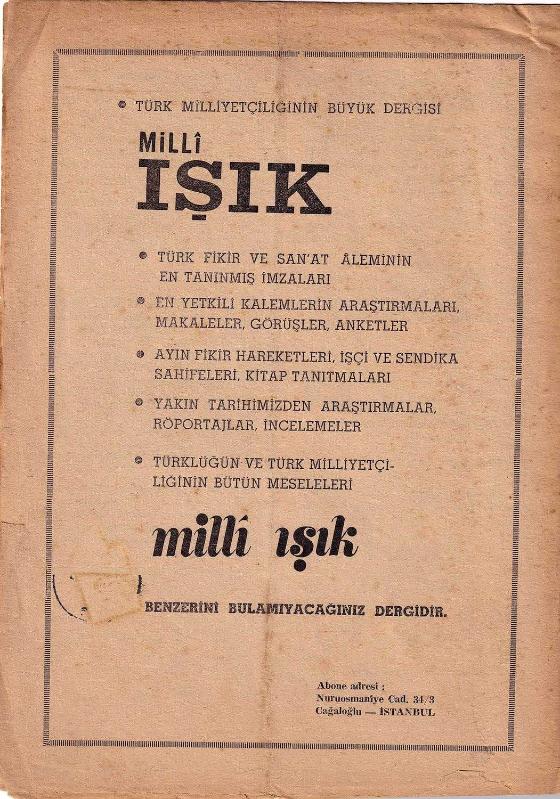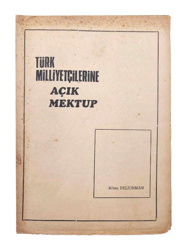 Özgün kapağında, çok temiz durumda, sayfa formaları açılmamıştır, 29 x 21 cm, 8 sayfa. [Milliyetçilik Bildirisi] "Türk Milliyetçilerine Açık Mektup", ALTAN DELİORMAN, Garanti Matbaası, İstanbul, 1969. Milli Işık dergisinin 22. sayısından ayrıbasım. Arka yüzde Milli Işık dergisi reklamı. Milliyetçileri tek bir dernek etrafında toplamak, ülke genelindeki milliyetçi derneklerin faaliyetlerinden bahsetmek ve anti-komünizm propagandası amacıyla yazılmıştır. -- Türkçülük Turancılık Milliyetçilik Anti-Komünizm propagandası