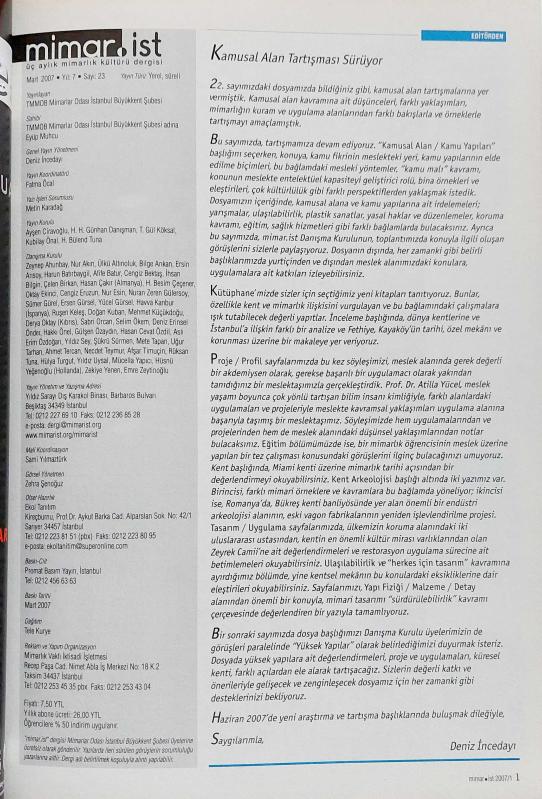 MİMAR.İST ÜÇ AYLIK MİMARLIK KÜLTÜRÜ DERGİSİ YIL : 7 - BAHAR 2007 SAYI : 23 112 SAYFA SIFIR DERGİ