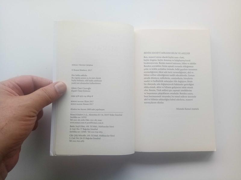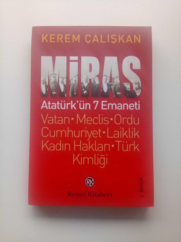 MİRAS (ATATÜRK'ÜN 7 EMANETİ) (YENİ), KEREM ÇALIŞKAN tarafından kaleme alınmıştır. Eser ÖNER CİRAVOĞLU editörlüğünde hazırlanmıştır. Kitap 2017 yılında REMZİ KİTABEVİ YAYINLARI tarafından [İSTANBUL] 978-975-14-1809-8 ISBN kodu ile yayınlanmıştır. Satışta olan kitap, yayınevinin 2. baskısıdır. 248 sayfadır. Sayfa bilgisi 2. HAMUR olarak belirtilmiştir. MİRAS (ATATÜRK'ÜN 7 EMANETİ) (YENİ) adlı eser Türkçe dilindedir.