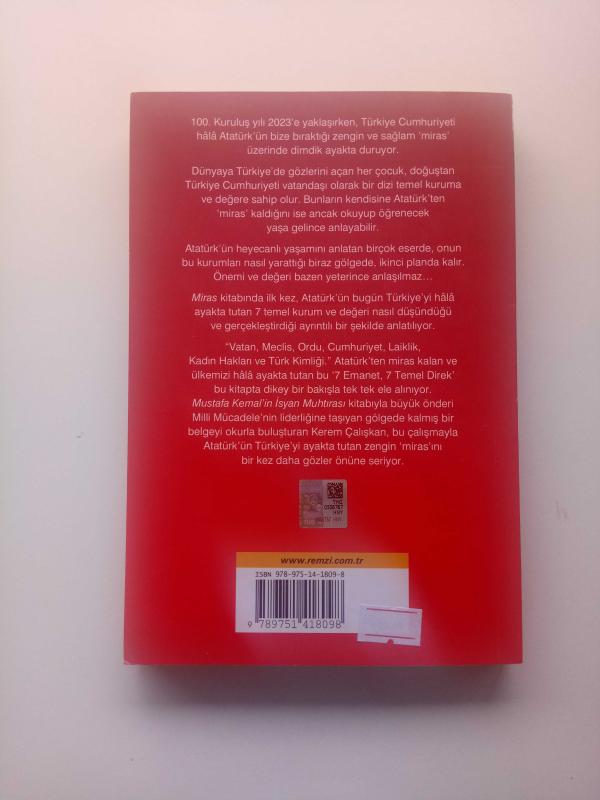 100. Kuruluş yılı 2023’e yaklaşırken, Türkiye Cumhuriyeti hâlâ Atatürk’ün bize bıraktığı zengin ve sağlam ‘miras’ üzerinde dimdik ayakta duruyor. Dünyaya Türkiye’de gözlerini açan her çocuk, doğuştan Türkiye Cumhuriyeti vatandaşı olarak bir dizi temel kuruma ve değere sahip olur. Bunların kendisine Atatürk’ten ‘miras’ kaldığını ise ancak okuyup öğrenecek yaşa gelince anlayabilir. Atatürk’ün heyecanlı yaşamını anlatan birçok eserde, onun bu kurumları nasıl yarattığı biraz gölgede, ikinci planda kalır. Önemi ve değeri bazen yeterince anlaşılmaz… Miras kitabında ilk kez, Atatürk’ün bugün Türkiye’yi hâlâ ayakta tutan 7 temel kurum ve değeri nasıl düşündüğü ve gerçekleştirdiği ayrıntılı bir şekilde anlatılıyor. “Vatan, Meclis, Ordu, Cumhuriyet, Laiklik, Kadın Hakları ve Türk Kimliği.” Atatürk’ten miras kalan ve ülkemizi hâlâ ayakta tutan bu ‘7 Emanet, 7 Temel Direk’ bu kitapta dikey bir bakışla tek tek ele alınıyor. Mustafa Kemal’in İsyan Muhtırası kitabıyla büyük önderi Milli Mücadele’nin liderliğine taşıyan gölgede kalmış bir belgeyi okurla buluşturan Kerem Çalışkan, bu çalışmayla Atatürk’ün Türkiye’yi ayakta tutan zengin ‘miras’ını bir kez daha gözler önüne seriyor.