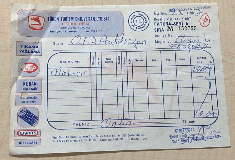 MOTORİN FATURASI - 19 AĞUSTOS 1987 - TÜREN TURİZM END.VE SAN.LTD.ŞTİ - PETROL OFİSİ SERVİS İSTASYONU - KUMKAPI, İSTANBUL - OSMAN FAHİR SEDEN, O.F.S. PRODÜKSİYON - BEYOĞLU, İSTANBUL - ISLAK İMZALI, KAŞELİ - 14 x 20 cm EBATLI ORİJİNAL FATURA - TÜRK SİNEMA - FİLM TARİHİ başlıklı ürün, Efemera, Müzik, Sinema > Belge ve Evraklar > Finansal Belge ve Evrak > Fatura kategorisi altında İkinci El olarak satılmaktadır.