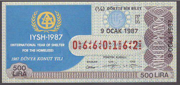 MP.092 MİLLİ PİYANGO 9 OCAK 1987 DÜNYA KONUT YILI K DÖRTTE BİR BİLET, 8 ay önce satışa sunulmuştur.