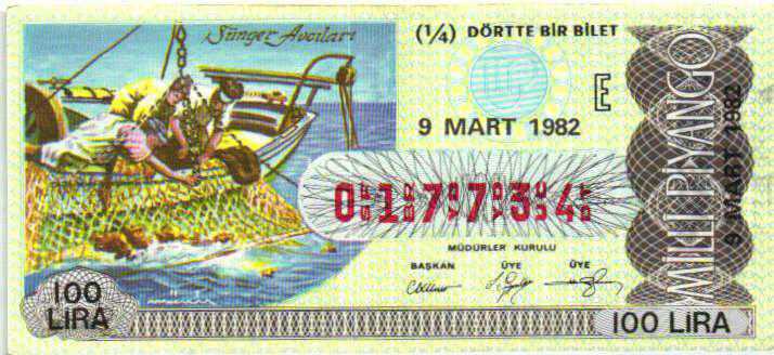 MP.1166 MİLLİ PİYANGO 9 MART 1982 SÜNGER AVCILARI DENİZ BALIKÇILIK E ÇEYREK BİLET, 7 yıl önce satışa sunulmuştur.