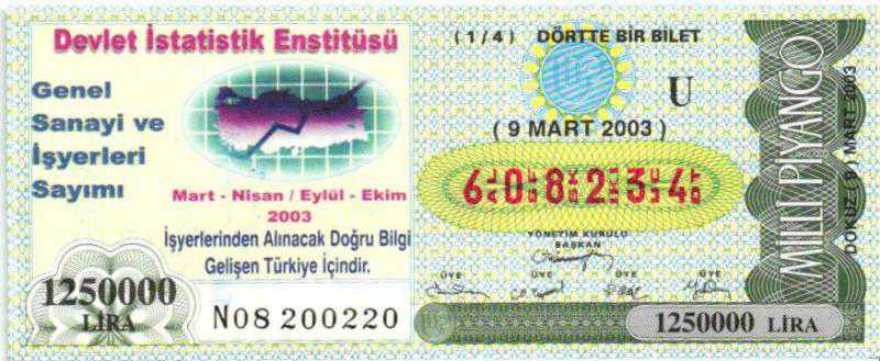 MP.2089 MİLLİ PİYANGO 9 MART 2003 DİE DEVLET İSTATİSTİK ENSTİTÜSÜ GENEL SANAYİ SAYIMI U ÇEYREK BİLET, 7 yıl önce satışa sunulmuştur.