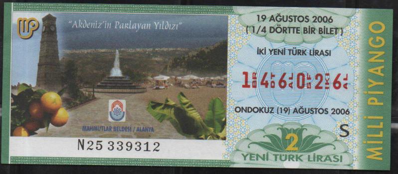 MP.2308 MİLLİ PİYANGO 19 AĞUSTOS 2006 AKDENİZ'İN PARLAYAN YILDIZI MAHMUTLAR BELDESİ ALANYA SAAT KULESİ S DÖRTTE BİR BİLET, en son 8 ay önce güncellenmiştir.