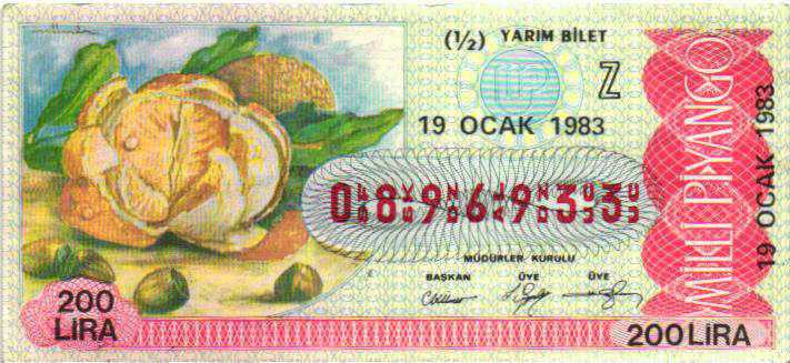 MP.238 MİLLİ PİYANGO 19 OCAK 1983 PORTAKAL LİMON FINDIK Y YARIM BİLET, en son 8 ay önce güncellenmiştir.