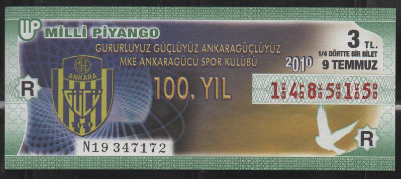 MP.2656 MİLLİ PİYANGO 9 TEMMUZ 2010 MKE ANKARAGÜCÜ SPOR KULÜBÜ 100.YIL GURURLUYUZ GÜÇLÜYÜZ ANKARAGÜÇLÜYÜZ R DÖRTTE BİR BİLET, 5 yıl önce satışa sunulmuştur.
