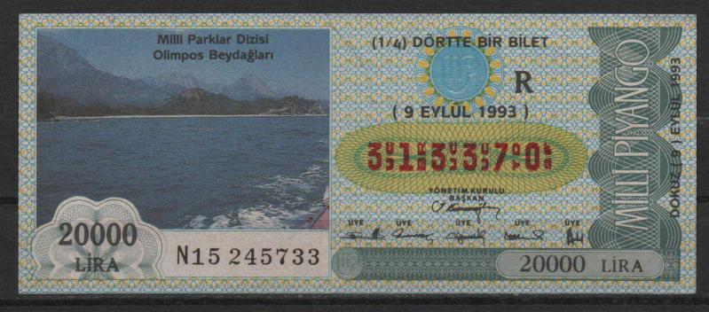 MP.569 MİLLİ PİYANGO 9 EYLÜL 1993 MİLLİ PARKLAR DİZİSİ OLİMPOS BEYDAĞLARI ANTALYA R DÖRTTE BİR BİLET, 5 yıl önce satışa sunulmuştur.