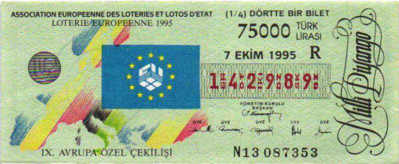 MP.732 MİLLİ PİYANGO 7 EKİM 1995 AVRUPA DEVLET PİYANGOLAR BİRLİĞİ IX. ÖZEL ÇEKİLİŞİ R ÇEYREK BİLET, 7 yıl önce satışa sunulmuştur.