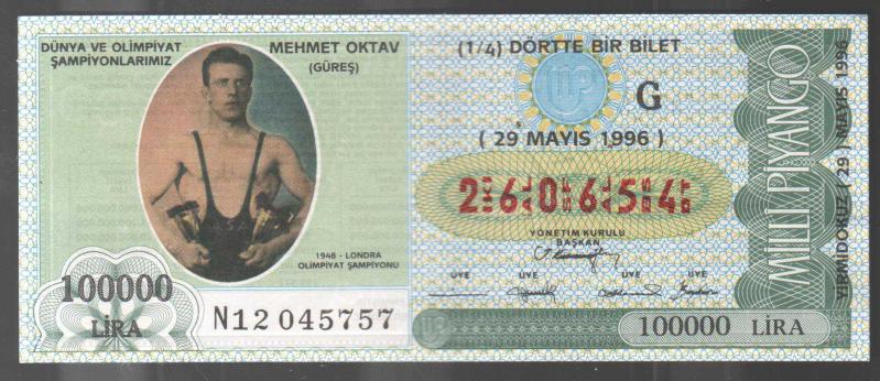 MP.773 MİLLİ PİYANGO 29 MAYIS 1996 DÜNYA OLİMPİYAT ŞAMPİYONLARIMIZ MEHMET OKTAV GÜREŞ 1948 LONDRA OLİMPİYAT OYUNLARI G DÖRTTE BİR BİLET, en son 10 ay önce güncellenmiştir.