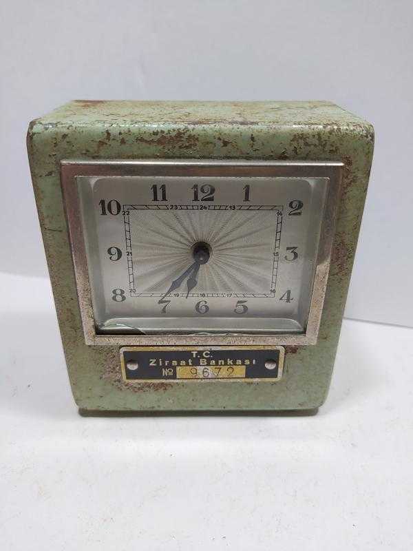 MS10-----ZİRAAT BANKASI KUMBARALI KURMALI MASA SAATİ--BAKIM İSTER başlıklı antika/koleksiyon objesinin menşei belirtilmemiştir. Objenin ait olduğu dönem bilinmeketedir.