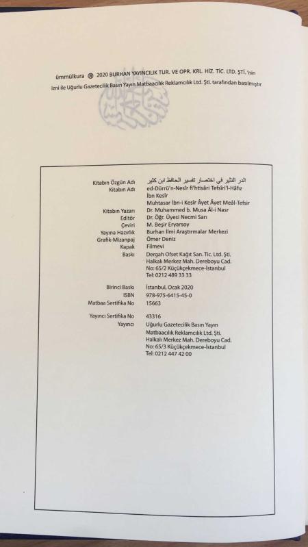 MUHTASAR İBN-İ KESİR TEFSİRİ Ayet Ayet Meal-Tefsir - Dr.Muhammed b.Musa Al-i Nasr *ŞAMUA KAĞIT* Ed Dürrün Nesir Fihtisari Tefsiril Hafız İbni Kesir | MUHTASAR İBNİ KESİR TEFSİRİ, Dr.MUHAMMED b.MUSA AL-İ NASR tarafından kaleme alınmıştır. Eser Dr.Muhammed b. Musa Al-i Nasr editörlüğünde hazırlanmıştır. Kitap 2020 yılında BURHAN YAYINCILIK tarafından [İSTANBUL] yayınlanmıştır. Bu baskının çevirisi M. BEŞİR ERYARSOY tarafından yapılmıştır. 1.232 sayfadır. MUHTASAR İBN-İ KESİR TEFSİRİ Ayet Ayet Meal-Tefsir - Dr.Muhammed b.Musa Al-i Nasr *ŞAMUA KAĞIT* Ed Dürrün Nesir Fihtisari Tefsiril Hafız İbni Kesir | MUHTASAR İBNİ KESİR TEFSİRİ adlı eser Türkçe dilindedir.