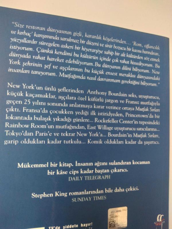 MUTFAK SIRLARI: Aşçılık Dünyasından Mahrem Maceralar.. Kitchen Confidential: Adventures in the Culinary Underbelly ©2000.. Anthony Bourdain.. (2014/6), ANTHONY BOURDAIN (1956-2018) tarafından kaleme alınmıştır. Eser Kapak: Deniz Çorbacıoğlu editörlüğünde hazırlanmıştır. Kitap 2014 yılında OĞLAK Yayıncılık tarafından [İstanbul] 9789753294584 ISBN kodu ile yayınlanmıştır. Satışta olan kitap, yayınevinin 6. baskısıdır. Bu baskının çevirisi DOST KÖRPE (1972-) tarafından yapılmıştır. 296 sayfadır. Sayfa bilgisi 1.hamur olarak belirtilmiştir. MUTFAK SIRLARI: Aşçılık Dünyasından Mahrem Maceralar.. Kitchen Confidential: Adventures in the Culinary Underbelly ©2000.. Anthony Bourdain.. (2014/6) adlı eser Türkçe dilindedir.