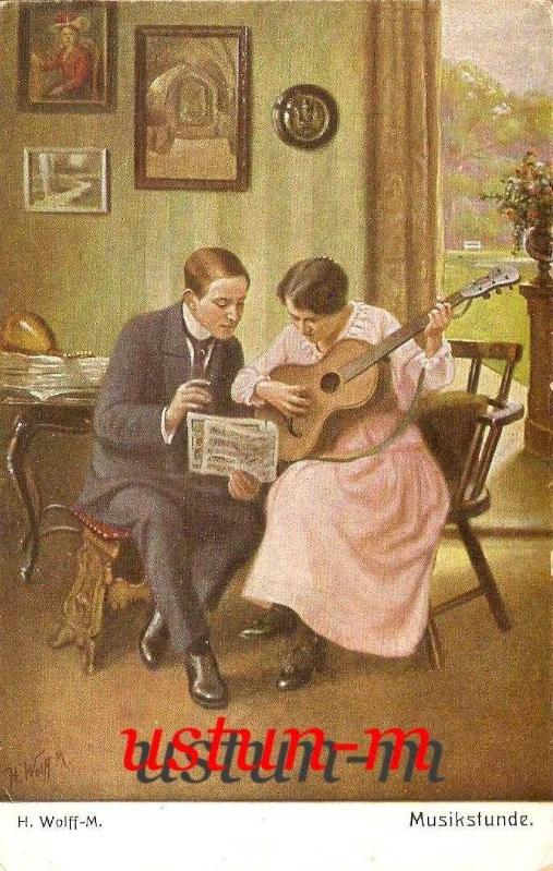 ** MÜZİK DERSİ VE GİTAR ÇALAN KIZ TEMALI KART ** 14 x 9 cm.ebadında,arkası yazısız ve temiz durumda karttır... R 1136... Verlag Hermann Wolff,Berlin...