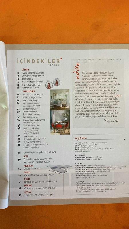 Kitap DİNÇBİLGİN tarafından yayınlanmıştır. 72 sayfadır. MY HOME DERGİSİ - NİSAN 2010 - YASEMİN AKSOY – M. MELDA NARMANLI ÇİMEN – REYHAN KIRMACI – MİNE YAMAN – YEŞİM SALİHOĞLU – PELİN ÖZKUL – GÜNSELİ BÜYÜKSAĞİŞ – CEM M. BAŞAR – CENGİZ GÜNEŞ – HASAN EGE TÜTÜNCÜOĞLU – SONAT GÖKSEL – YUDUM ÜNAL – ZEHRA ŞEYDA ŞENTÜRK – ALİ ARSLAN – BİRSEN CANBAZ – CAMPANA BROTHERS - EVİNİZ İÇİN FARKLI ÇÖZÜMLER — TREND: BEYAZ VE RAHAT — EVİNİZDEKİ FARKLI KÖŞELER İÇİN 70 AKSESUAR — RENKLERİN ETKİLERİ — YAPI MALZEMELERİNDE YENİLİKLER — ÇERÇEVELERİ NASIL SEÇMELİ? — ÇATI KATI DEKORASYONU — DOĞAYLA BAŞ BAŞA BİR EV — KİTAP OKUMA KÖŞELERİ — ORMANI EVİNİZE GETİRİN — ROMANTİKA — YATAK ODASI SAKİNLİĞİ — NEO-POP SEÇİMLER — FANTASTİK PLASTİK — AKDENİZLİ BİR YAŞAM BİÇİMİ — BİRLİKTEN DOĞAN KUVVET — TEKNOLOJİ KONSEPTİ — EKOLOJİK YÜZEYLER — BAHÇE KEYFİ BAŞLIYOR — ZEMİNDEKİ SANAT — RÜYA GİBİ YATAK ODALARI — ÇERÇEVELER HAKKINDA HER ŞEY - 72 SAYFA adlı eser Türkçe dilindedir.