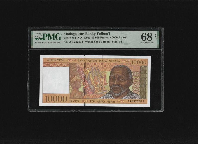 Madagaskar Madagascar Banky Foiben'i 10.000 Francs Frank = 2000 Ariary P79a ND (1995) PMG 68 EPQ SUPERB GEM UNC ÇİL SN A40322974 EPQ - Olağanüstü kağıt kalitesi 68 Çil %95 Superb Gem Unc Bu banknotlar da 69-70 puan alanlar gibi kusursuz ve çildir. Gözle görülebilir bir fark yoktur. 69-70 puan banktnotlardan tek farkı, motifin az da olsa kaymış olabilmesidir. Kağıt renk kaybı ve bozulması olmaksızın temiz ve düzgündür. Köşeler keskin ve sivridir, yuvarlaklaşma kesinlikle yoktur. Para kendi doğal parlaklığındadır.