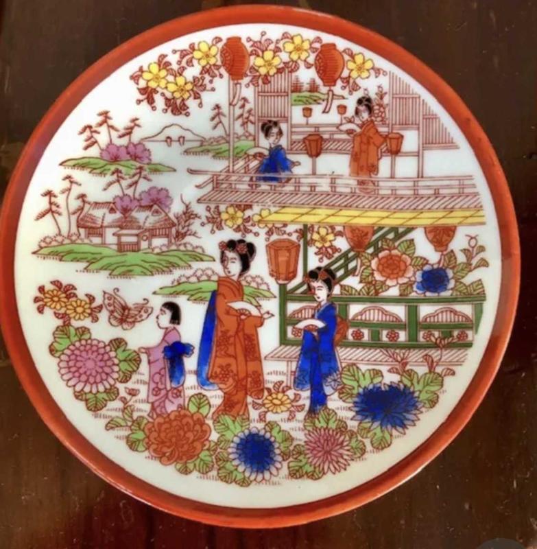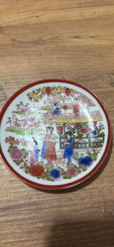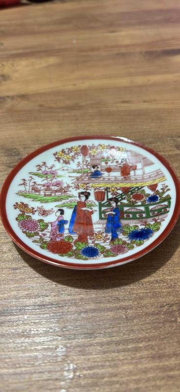 Made in Japan Geisha Temalı Dekoratif Tabak (1950–1970) Japon üretimi, üzerinde geleneksel Geisha figürleri ve çiçek motifleri bulunan dekoratif porselen tabak. Arka damgalı: “Made in Japan”. 1950–1970 dönemi ihracat üretimidir. Renkleri canlı, baskı net ve vitrinde oldukça şık durur. Kırık, çatlak ya da tamir yoktur. Koleksiyon ve dekor amaçlı uygundur. Çapı 11,5 cm