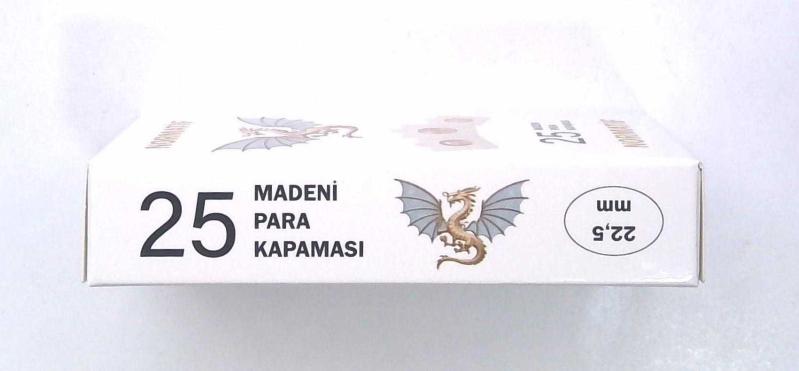 Madeni para koleksiyonları için kapamalar. 25 adetlik KUTU ŞEKLİNE 1 Paket halindedir. Diğer ölçüler için ilanlarımıza bakınız. Para deliği çapı 22,5 mm İçine koyacağınız paranın 1-1,5 mm büyüğüne koymanız tavsiye edilir. Örneğiniz kapatacağınız madeni para 21mm ise 22 ya da 22,5 mm lik kapama kullanmanız önerilir.