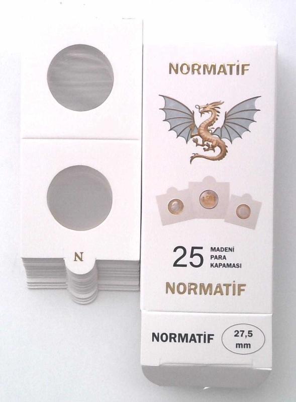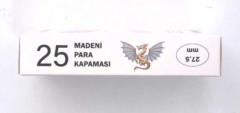 Madeni para koleksiyonları için kapamalar. 25 adetlik KUTU ŞEKLİNE 1 Paket halindedir. Diğer ölçüler için ilanlarımıza bakınız. Para deliği çapı 27,5 mm İçine koyacağınız paranın 1-1,5 mm büyüğüne koymanız tavsiye edilir. Örneğiniz kapatacağınız madeni para 21mm ise 22 ya da 22,5 mm lik kapama kullanmanız önerilir.