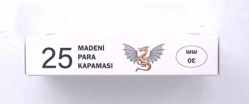 Madeni para koleksiyonları için kapamalar. 25 adetlik KUTU ŞEKLİNE 1 Paket halindedir. Diğer ölçüler için ilanlarımıza bakınız. Para deliği çapı 30 mm İçine koyacağınız paranın 1-1,5 mm büyüğüne koymanız tavsiye edilir. Örneğiniz kapatacağınız madeni para 21mm ise 22 ya da 22,5 mm lik kapama kullanmanız önerilir.