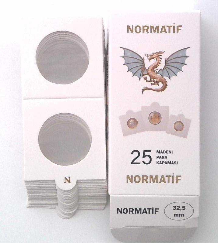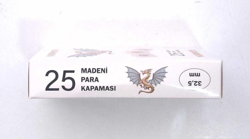Madeni para koleksiyonları için kapamalar. 25 adetlik KUTU ŞEKLİNE 1 Paket halindedir. Diğer ölçüler için ilanlarımıza bakınız. Para deliği çapı 32,5 mm İçine koyacağınız paranın 1-1,5 mm büyüğüne koymanız tavsiye edilir. Örneğiniz kapatacağınız madeni para 21mm ise 22 ya da 22,5 mm lik kapama kullanmanız önerilir.