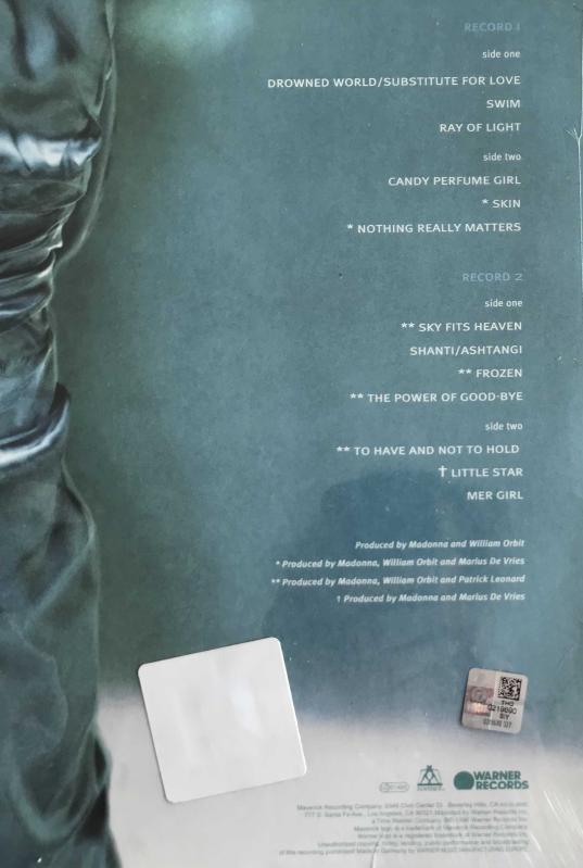 2019 Avrupa baskı ve 2 plak olan albüm, orjinal ambalajında açılmamış, kullanılmamıştır. Birçok otorite tarafından Madonna’nın zirve albümü olarak görülmektedir. Fotoğrafların hepsi plakların orjinal fotoğraflarıdır. Tüm plaklar özel plak kutusunda, aksi belirtilmedikçe yurtiçi veya aras kargo ile gönderilir. Kondisyon: Ambalajında (S.S) Label: Maverick – 9362-46847-1, Warner Records – 9361-46847-1 Format: 2 x Vinyl, LP, Album, Reissue, Stereo Country: Europe Released: 2019 Genre: Electronic, Pop Style: House, Techno, Downtempo, Ambient, Dance-pop Albüm İçeriği; A1 Drowned World / Substitute For Love 5:09 A2 Swim 5:00 A3 Ray Of Light 5:21 B1 Candy Perfume Girl 4:34 B2 Skin 6:22 B3 Nothing Really Matters 4:27 C1 Sky Fits Heaven 4:48 C2 Shanti / Ashtangi 4:29 C3 Frozen 6:12 C4 The Power Of Good-Bye 4:10 D1 To Have And Not To Hold 5:23 D2 Little Star 5:18 D3 Mer Girl 5:32