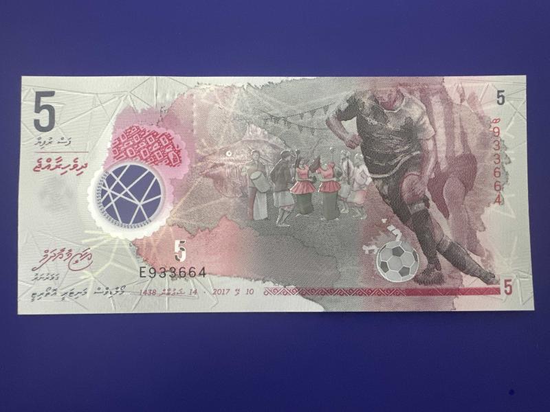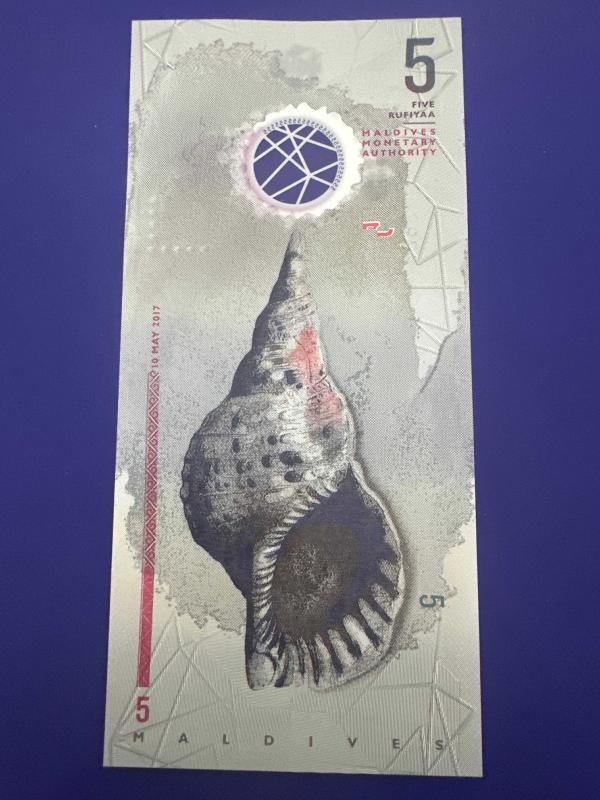 Maldivler 5 Rufiya 2017. Çil. Polimer, bir ay önce satışa sunulmuştur.