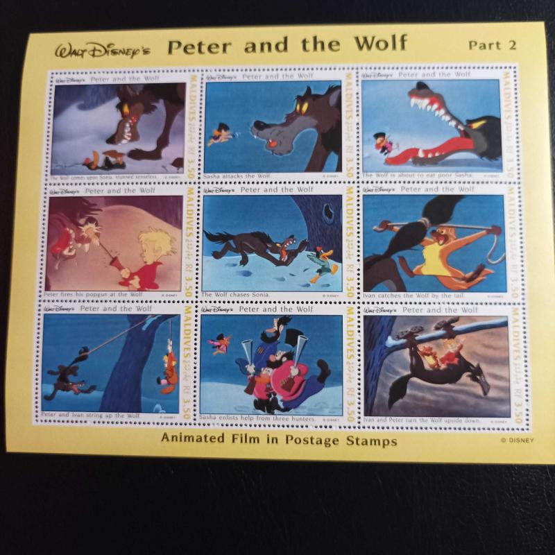 Maldivler tarafından 1993 yılında çıkarılan "Walt Disney's Peter and the Wolf" (Peter ve Kurt) temalı hatıra bloğu MNH