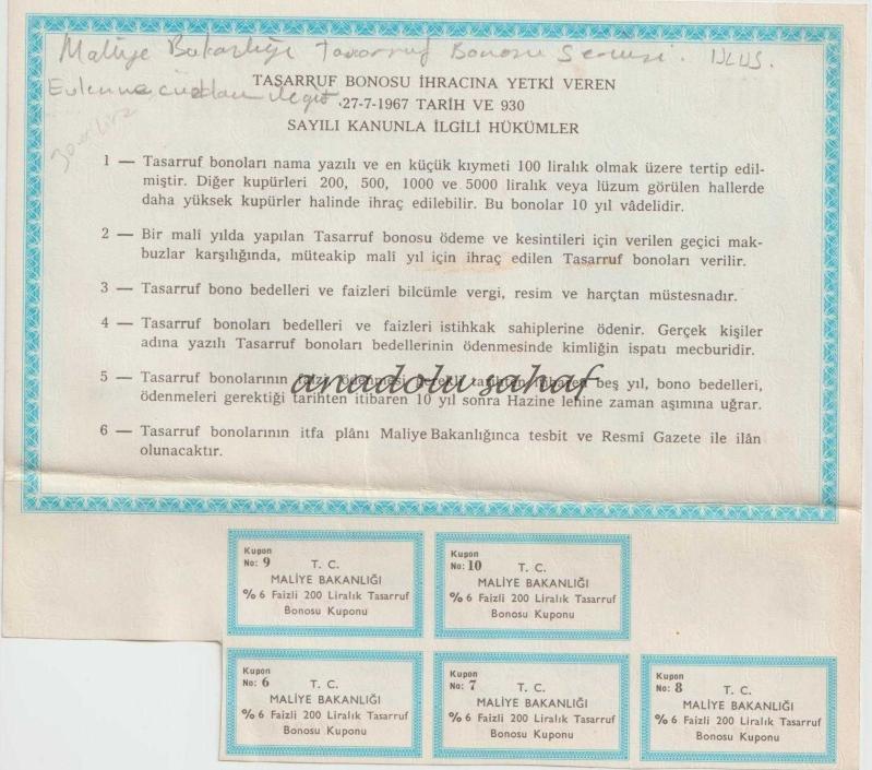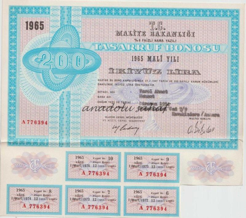 Maliye Bakanlığı Nama Yazılı Tasarruf Bonosu 1965 Mali Yılı İki Yüz Lira, en son 1 yıl önce güncellenmiştir.