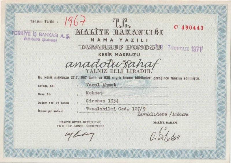 Maliye Bakanlığı Nama Yazılı Tasarruf Bonosu Kesir Makbuzu 50 TL, 28 Temmuz 1971, 4 yıl önce satışa sunulmuştur.