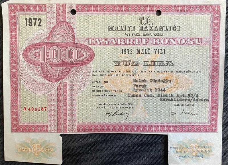 Maliye Bakanlığı Tasarruf Bonosu 100 Lira 1972, 1 yıl önce satışa sunulmuştur.