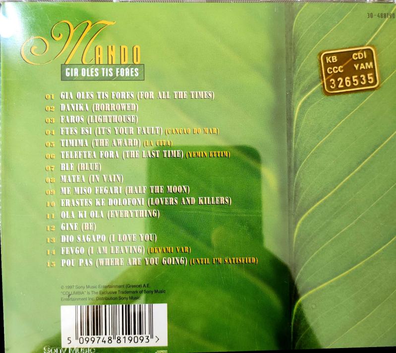 Mando / Gia oles tis fores başlıklı ürün, Efemera, Müzik, Sinema > Müzik, Plak, Kaset, CD > Müzik CD'si > Yabancı Müzik CD kategorisi altında İkinci El olarak satılmaktadır.