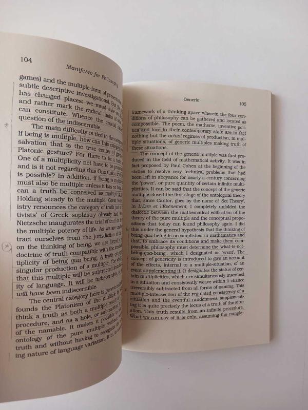 Manifesto For Philosophy, Alain Badiou tarafından kaleme alınmıştır. Kitap 1999 yılında State University Of New York Press tarafından [New York] yayınlanmıştır. 181 sayfadır. Manifesto For Philosophy adlı eser İngilizce dilindedir.