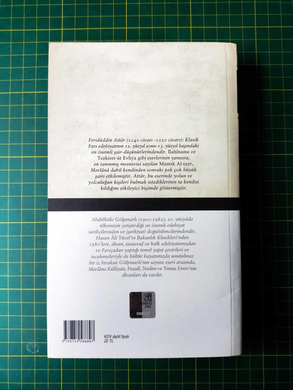 Mantık Al -Tayr, Feridüddin Attar tarafından kaleme alınmıştır. Kitap 2013 yılında İş Bankası Kültür Yayınları tarafından [İstanbul] 9789754588897 ISBN kodu ile yayınlanmıştır. Bu baskının çevirisi Abdülbaki Gölpınarlı tarafından yapılmıştır. 379 sayfadır. Mantık Al -Tayr adlı eser Türkçe dilindedir.