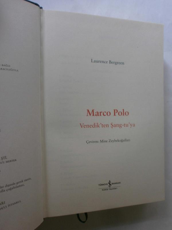 Marco Polo - Venedik'ten Şang-tu'ya, Laurence Bergreen tarafından kaleme alınmıştır. Kitap 2018 yılında Türkiye İş Bankası Kültür Yayınları tarafından [İstanbul] yayınlanmıştır. Satışta olan kitap, yayınevinin 1. baskısıdır. Bu baskının çevirisi Mine Zeybekoğulları tarafından yapılmıştır. 455 sayfadır. Marco Polo - Venedik'ten Şang-tu'ya adlı eser Türkçe dilindedir.