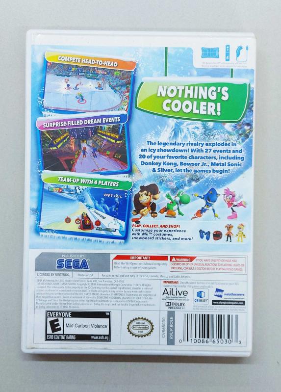 2009 yılında piyasaya sürülen, Nintendo ve Sega iş birliği ile yapılan orijinal Nintendo Wii oyunu Mario & Sonic at the Olympic Winter Games. NTSC versiyondur. Kitapçık mevcuttur. Oyun denenmiştir, sorunsuz bir şekilde çalışmaktadır. Son fotoğrafta çalışır halde görüntüsü mevcuttur. Son derece nadirdir. Kutulu Nintendo Wii oyunu biriktirenler ve Mario & Sonic hayranları için arşivlik bir üründür.