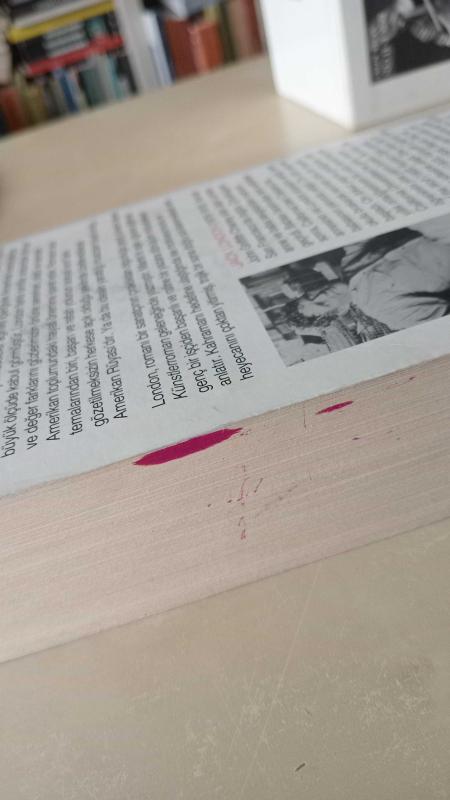 Son sayfaların kenarda metne nüfus etmeyen lekeler var. Okumaya engel bir durum yok.