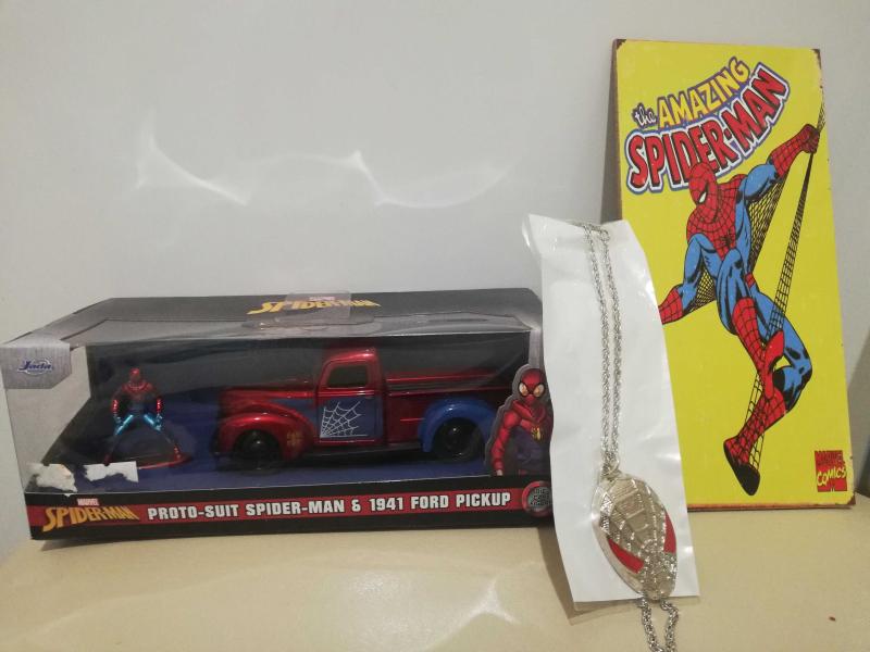 Marvel Spiderman Örümcek Adam metal figür ve 1941 ford pickup metal model araba set Sıfır paketli kutusunda yanında gümüş kaplama kolye ve ahşap duvar süs ü mini poster afiş koleksiyon dekor hediye nostalji tasarım süs hobi eğlence vintage aksesuar promosyon reklam Hediyelik dekorluk retro