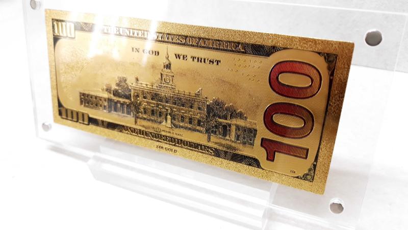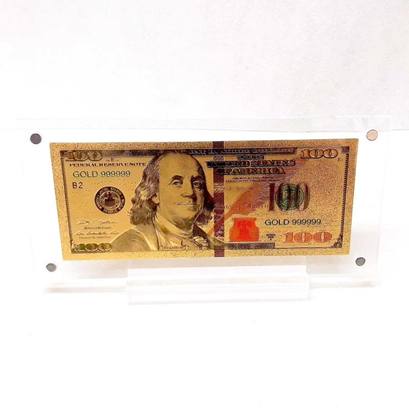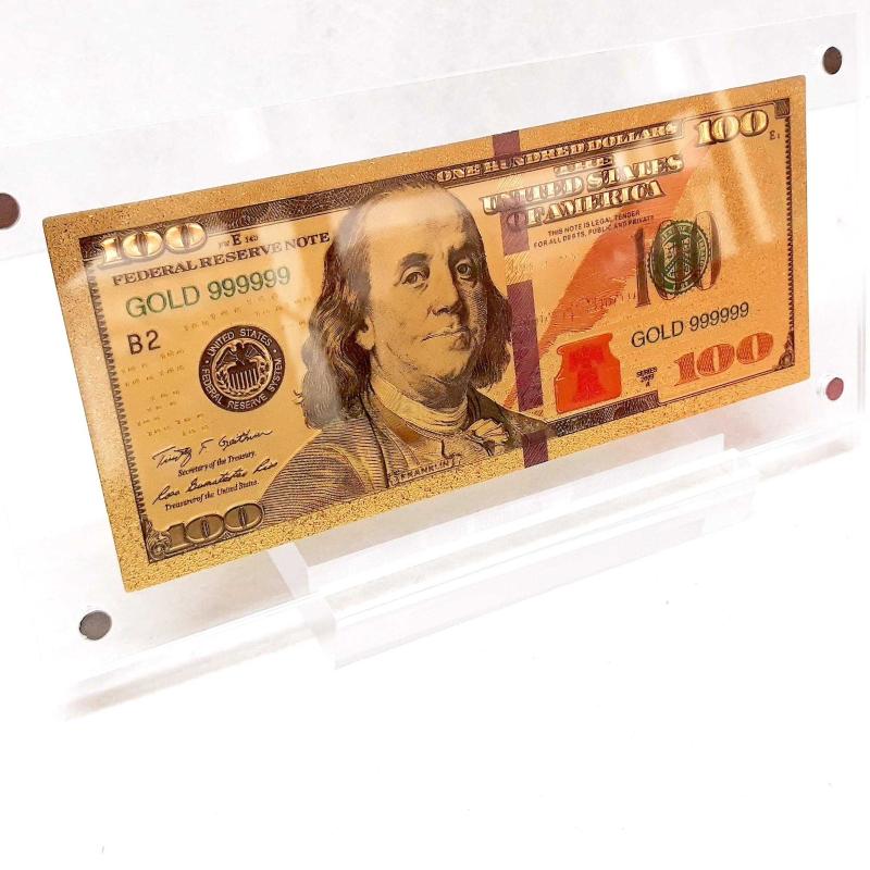 Masa üstü şeffaf sergi standında, Altın 24K Gold 100$ Altın Varak 100 $ Koleksiyonluk, Hediyelik Sevdikleriniz için çok değerli ve sıradışı bir hediye Gerçek para boyutlarındadır.