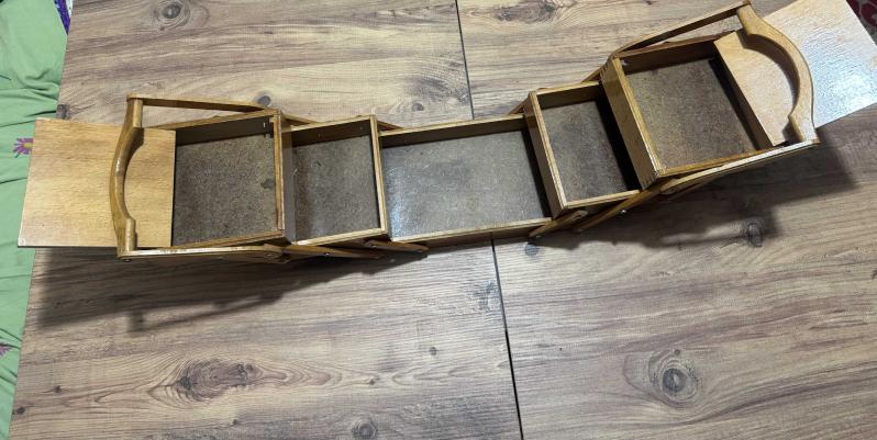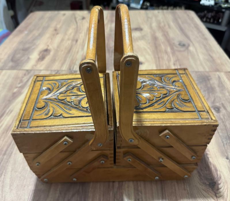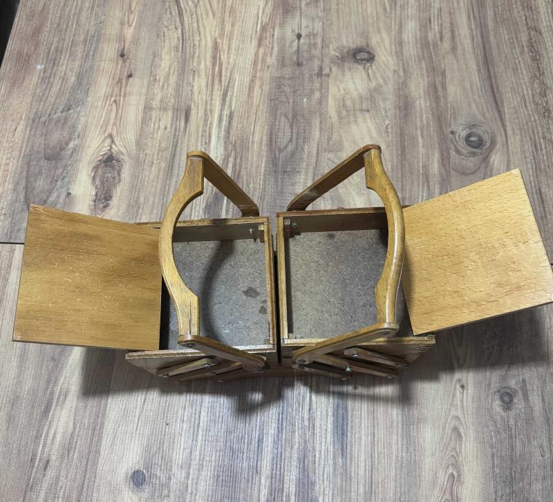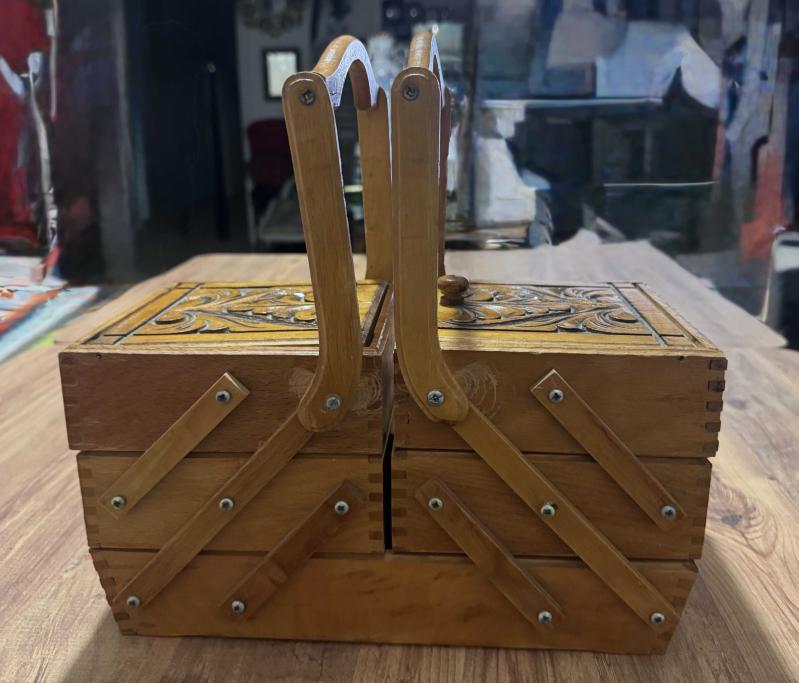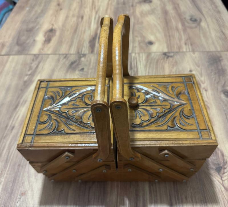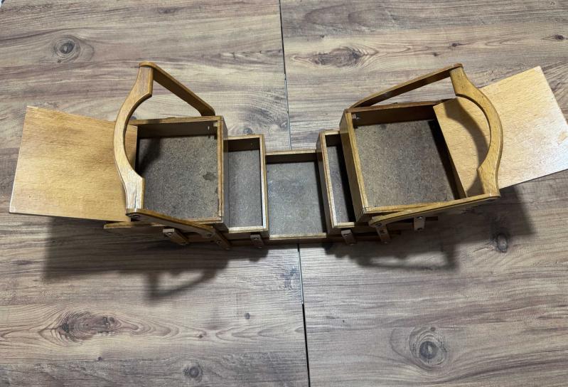 Masif Ahşap El Oyması Akordiyon Takı & Dikiş Kutusu Tamamı ahşap, el işçiliğiyle oyulmuş, nostaljik ve şık bir saklama kutusu. Özel akordiyon mekanizması sayesinde yana doğru açılarak 5 farklı bölme sunar. Hem dekoratif bir obje hem de dikiş, takı veya hobi malzemeleriniz için mükemmel bir düzenleyicidir. Kondisyonu fotoğraflarda görüldüğü gibi çok iyi durumdadır. Masif Ahşap El oyması kapak detaylı 3 katlı, 5 bölmeli akordiyon