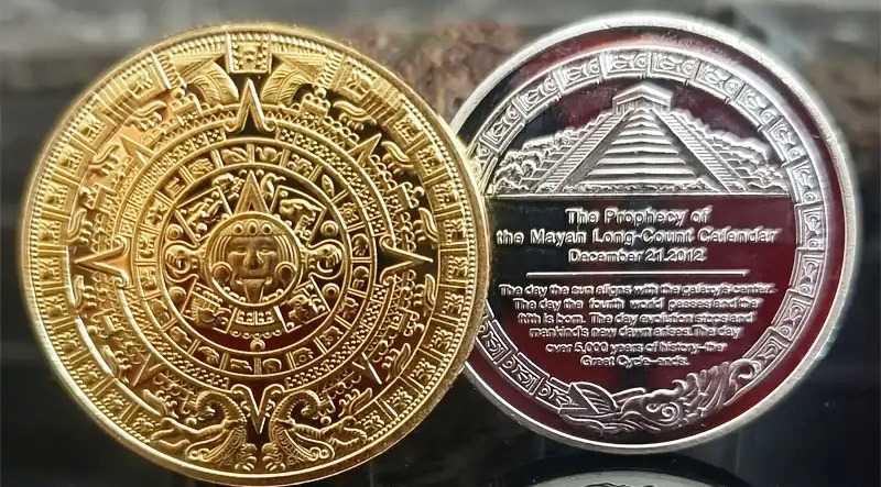 Maya Madalyonu 2 adet (bir altın ve bir gümüş kaplama) Meksika Maya Aztek Takvimi Sanat Kehanet Kültürü Koleksiyon Anma Madalyonu