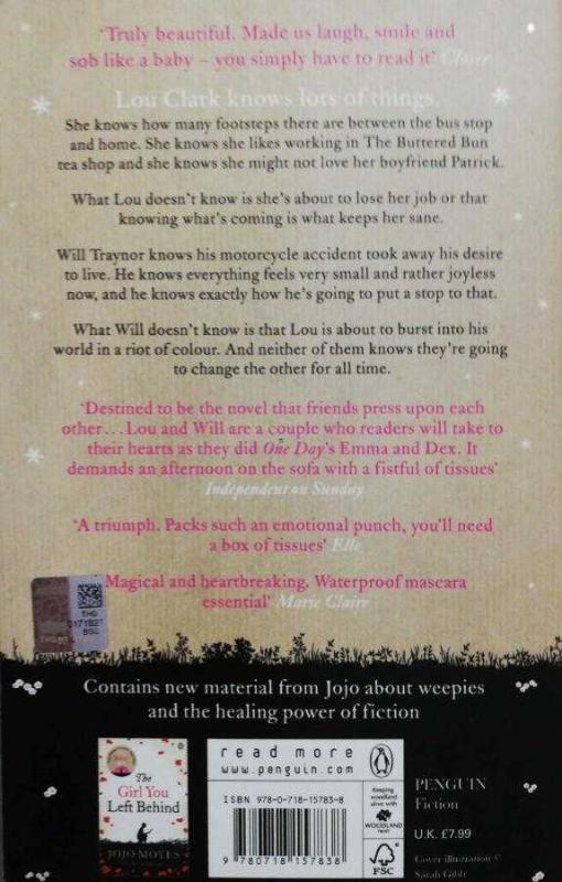 Me Before You, Jojo Moyes tarafından kaleme alınmıştır. Kitap 2012 yılında Penguin Books tarafından yayınlanmıştır. 481 sayfadır. Me Before You adlı eser İngilizce dilindedir.