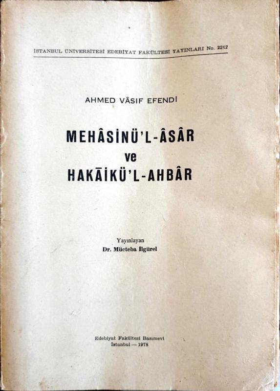 Mehasinü'l- Asar ve Hakaikül- Ahbar (Vasıf Tarihi, Osmanlı Tarihi 1209-1219 / 1794-1805 ), Ahmed Vasıf Efendi tarafından kaleme alınmıştır. Eser Dr. Mücteba İLGÜREL editörlüğünde hazırlanmıştır. Kitap 1978 yılında İstanbul Üniversitesi Edebiyat Fak. Yayınları tarafından [İstanbul] 9789751605814 ISBN kodu ile yayınlanmıştır. Satışta olan kitap, yayınevinin 1. baskısıdır. 444 sayfadır. Mehasinü'l- Asar ve Hakaikül- Ahbar (Vasıf Tarihi, Osmanlı Tarihi 1209-1219 / 1794-1805 ) adlı eser Türkçe dilindedir.