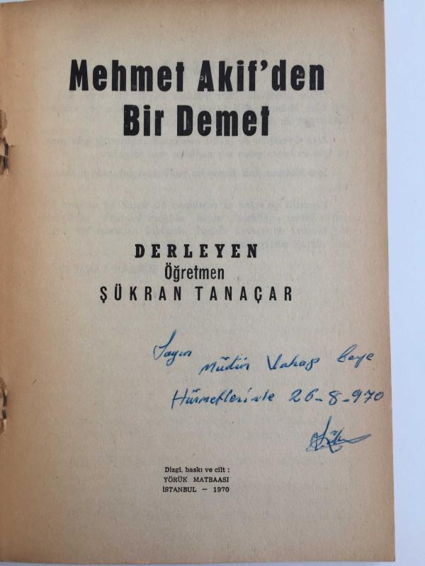 Eser Şükran Tanaçar editörlüğünde hazırlanmıştır. Kitap 1970 yılında Yörük Matbaası tarafından [İstanbul] yayınlanmıştır. 83 sayfadır. Mehmet Akif'den Bir Demet (İmzalı) adlı eser Türkçe dilindedir.